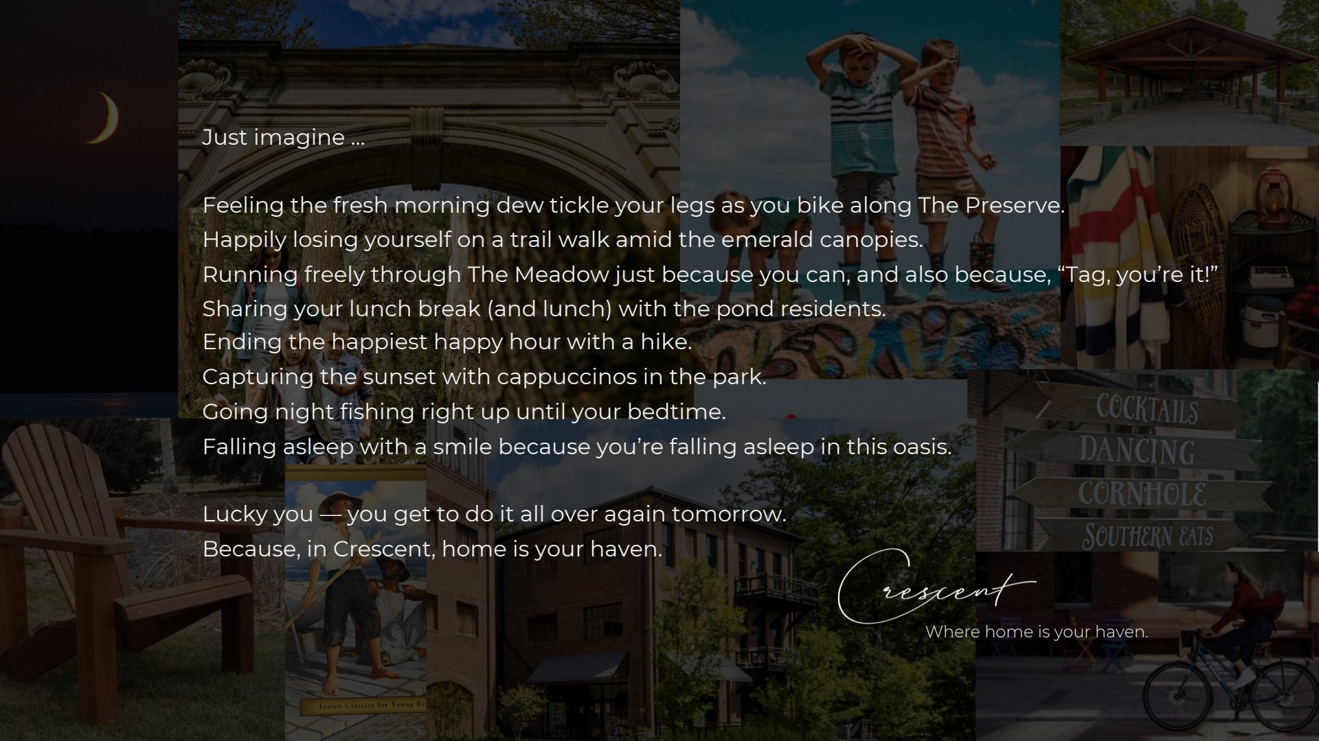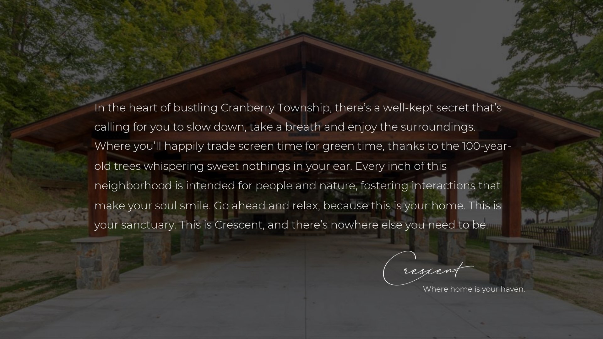 We knew this much: Charter neighborhoods are for place-conscious homebuyers. For Crescent, Charter's upcoming neighborhood in the Pittsburgh area, we needed to define what type of place Crescent would be, and we did it by developing a brand narrative and overarching themes for future storytelling. We kicked things off by going on-site to experience the land firsthand — its past, its present and its huge potential for a future. Hiking through waist-high brush while dodging 100-year-old trees to get to a trail that circled an old pond, we could tell this oasis was destined for great things. Then, I let the magic happen. I tapped into all the feels and started writing the story of Crescent, including a tagline to bring it home.